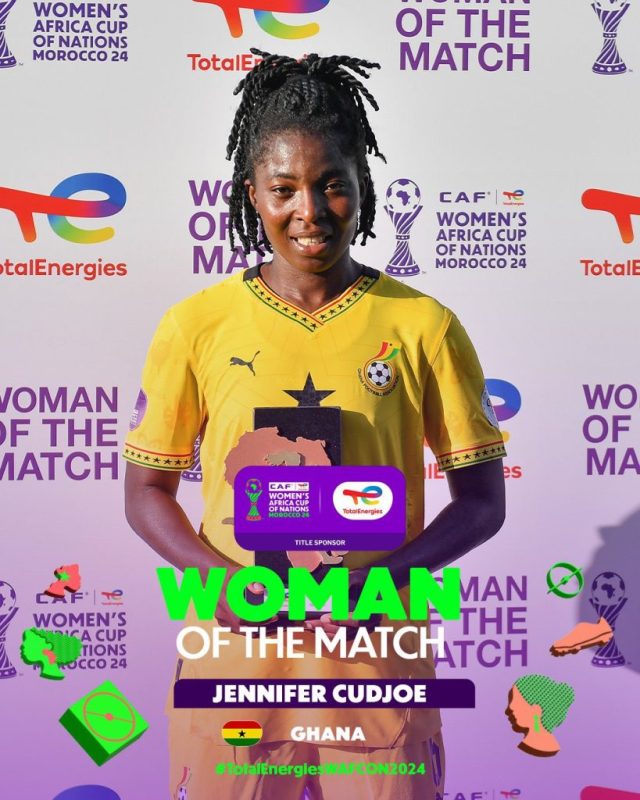 Exceptional performance from Ghana’s Jennifer Cudjoe earns her the TotalEnergies Woman of the Match award. 👏@Football2Gether | #TotalEnergiesWAFCON2024 pic.twitter.com/iCcwmXMmz4
