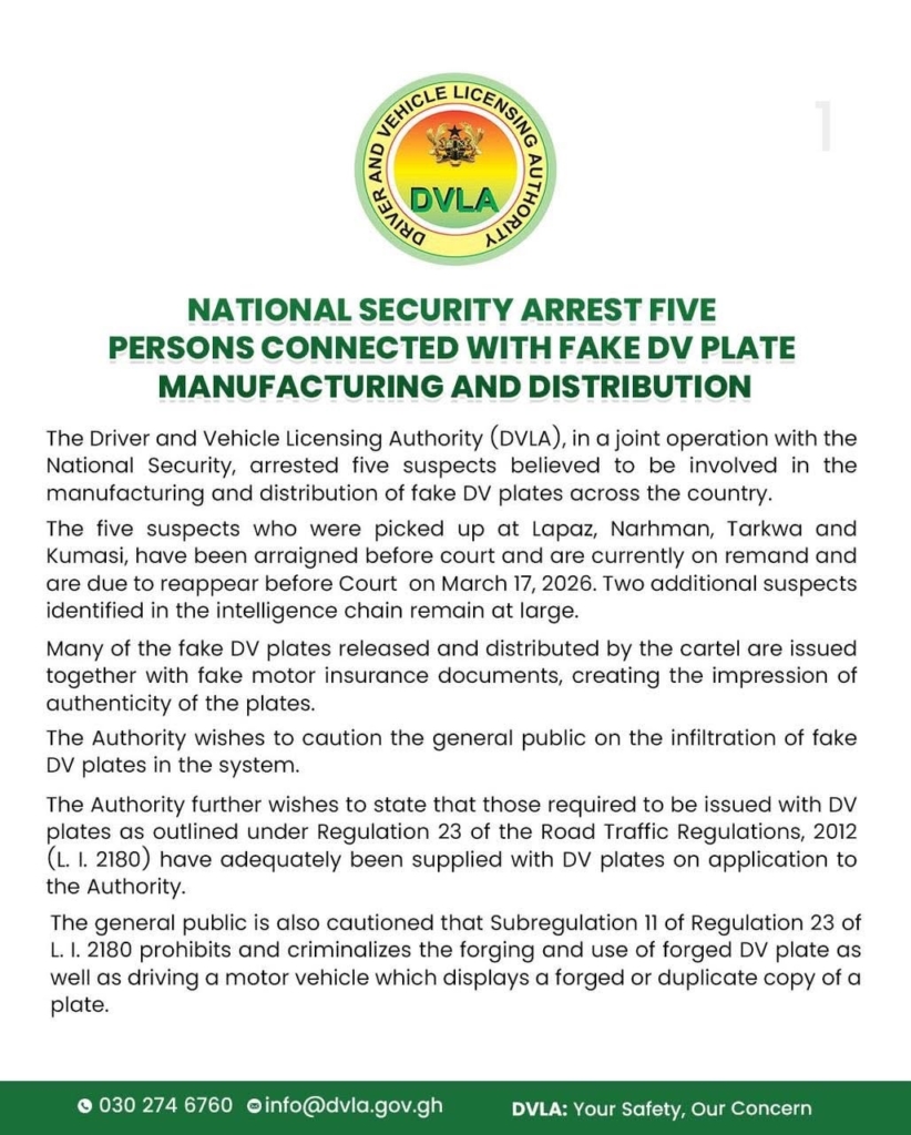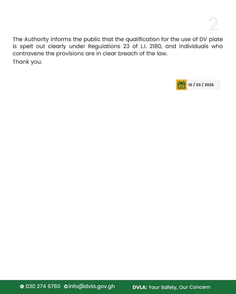 The Authority cautioned the public about the increasing infiltration of fake DV plates in the system, stressing that Regulation 23 of the Road Traffic Regulations, 2012 (L.I. 2180) clearly outlines who qualifies to be issued with DV plates.