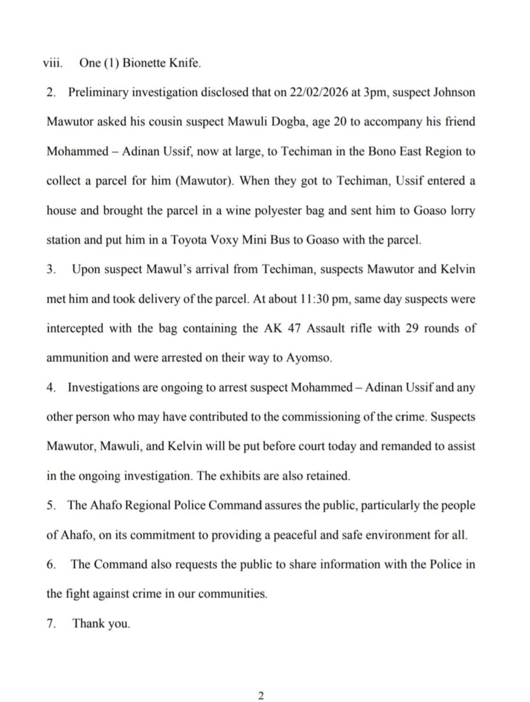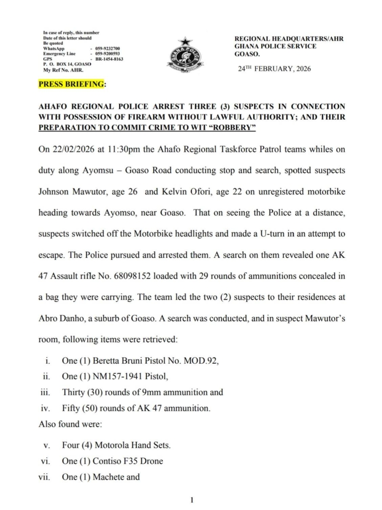 According to the police in a statement, the patrol team was on routine duty at about 11:30 pm on February 22, 2026, when they spotted two men on an unregistered motorbike heading towards Ayomso near Goaso. On seeing the police from a distance, the suspects allegedly switched off the motorbike’s headlights and made a U-turn in an attempt to escape.
