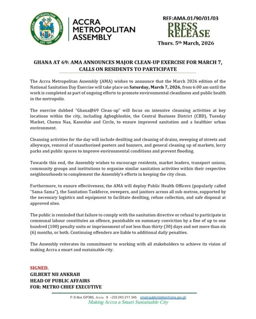 The Accra Metropolitan Assembly (AMA) has announced that the March 2026 edition of the National Sanitation Day exercise will take place on Saturday, March 7, 2026, beginning at 6:00 a.m. and continuing until the day’s work is completed.
