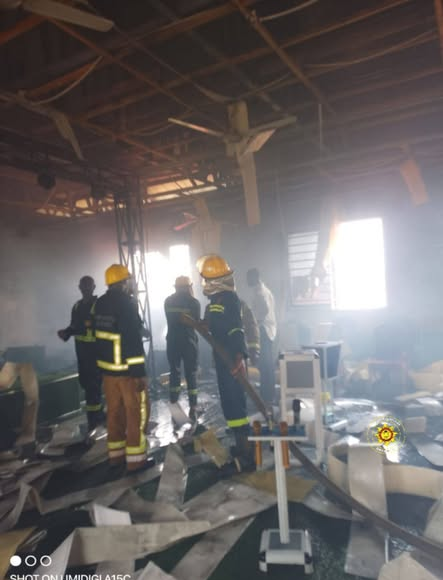 The fire broke out in the church auditorium on the top floor of the two-storey building and was already underway when firefighters arrived on the scene. Reinforcements from the Madina Fire Station joined the crew in tackling the blaze.