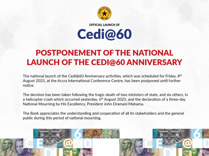 The Bank of Ghana (BoG) has announced that the national launch of the Cedi@60 anniversary, which was scheduled to take place on Friday, 8 August 2025, has been postponed until further notice.