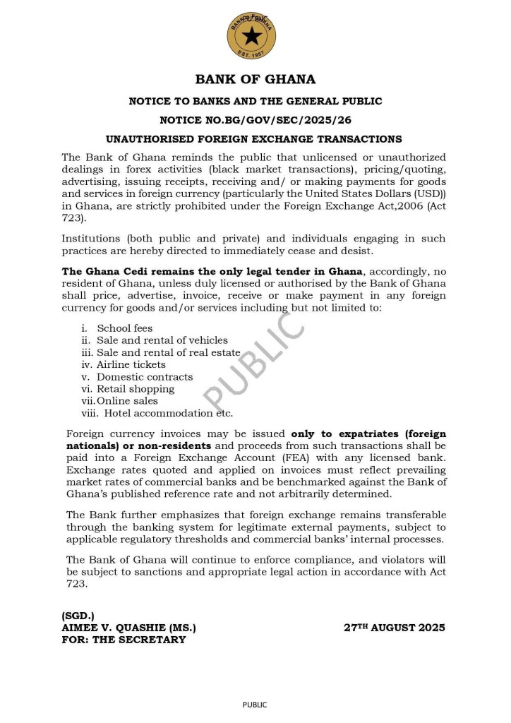 In a public notice dated August 27, 2025, the central bank emphasised that unlicensed forex activities — including black market transactions, pricing, advertising, issuing receipts, and making or receiving payments in foreign currency, particularly in US dollars — remain strictly prohibited in Ghana.