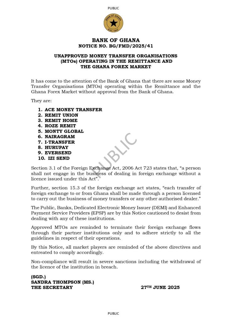 The Bank of Ghana (BoG) has issued a strong warning to the public and financial institutions about ten money transfer companies that are operating illegally in the country.