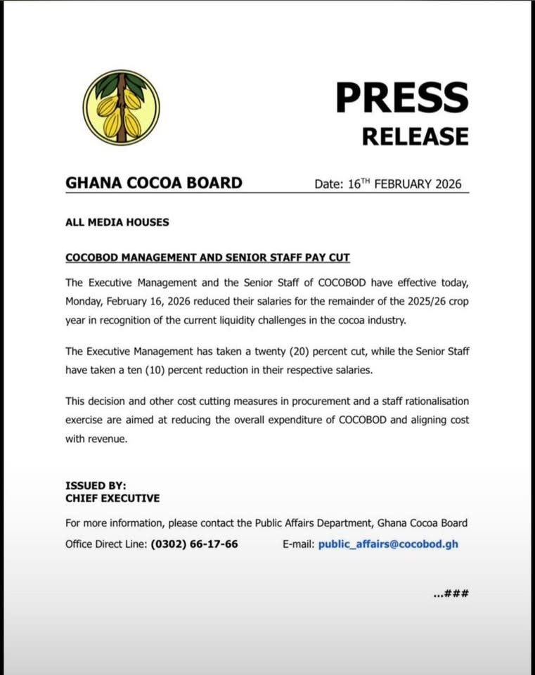 The executive management and senior staff of the Ghana Cocoa Board (COCOBOD) have voluntarily agreed to salary reductions in response to the current liquidity challenges facing the cocoa industry.