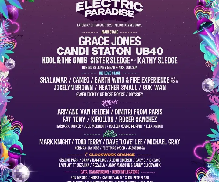 Electric Paradise arrives this summer as a brand-new open-air festival experience at Milton Keynes’s National Bowl on Saturday 8 August. An era-spanning blend of disco, funk, soul and house plays out across multiple stages of this inaugural edition, which is a large-scale, feel-good celebration for a broad, music-loving audience. Tickets go on sale Friday 27 February at 9AM. First release tickets start from £59.50, with VIP packages available from £150.