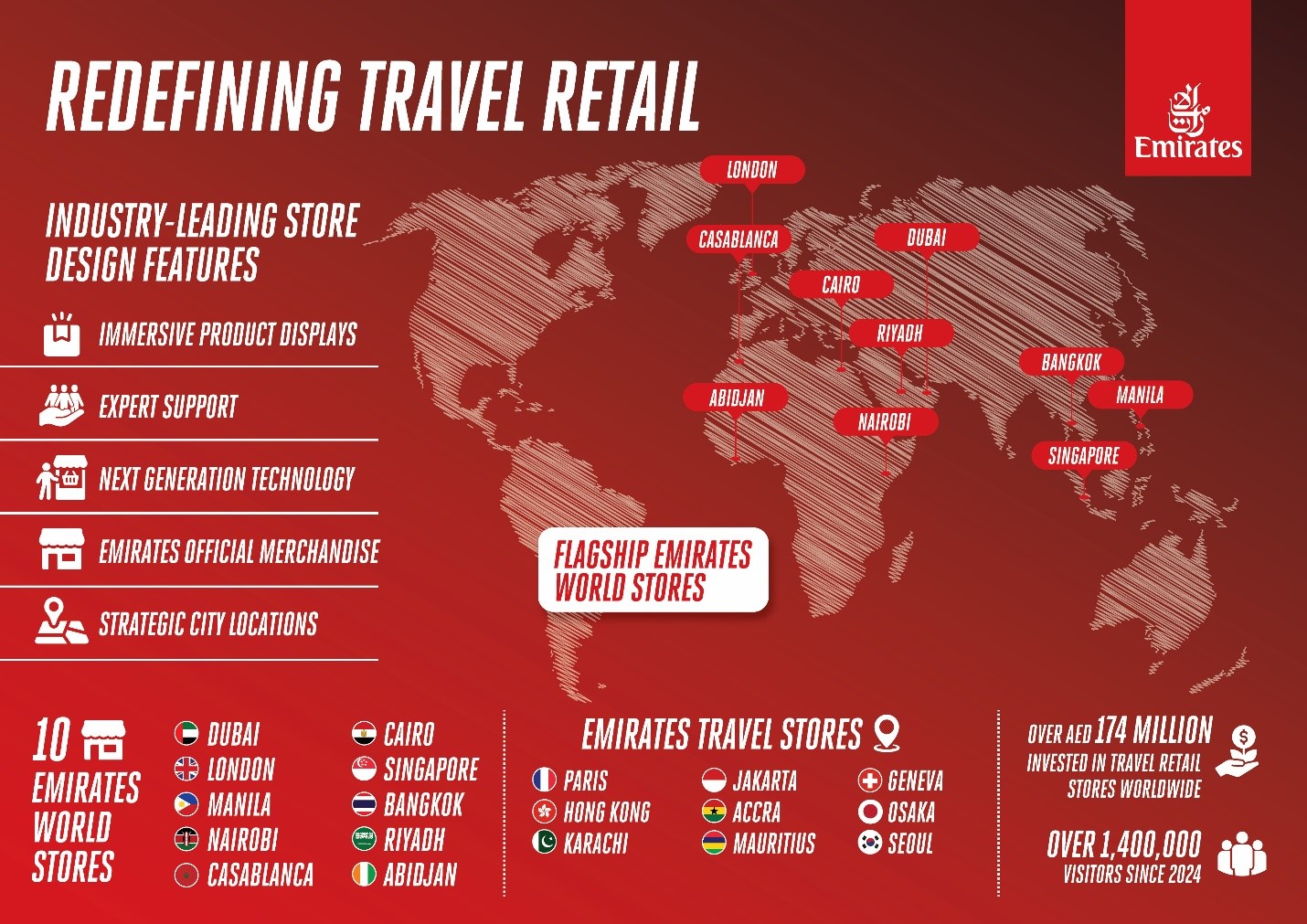 The flagship Emirates World Store in Dubai became the blueprint propelling the acceleration of the airline’s retail expansion strategy with global flagship store openings in London, Nairobi, Casablanca, Manila, Cairo, Singapore, Bangkok and Riyadh.