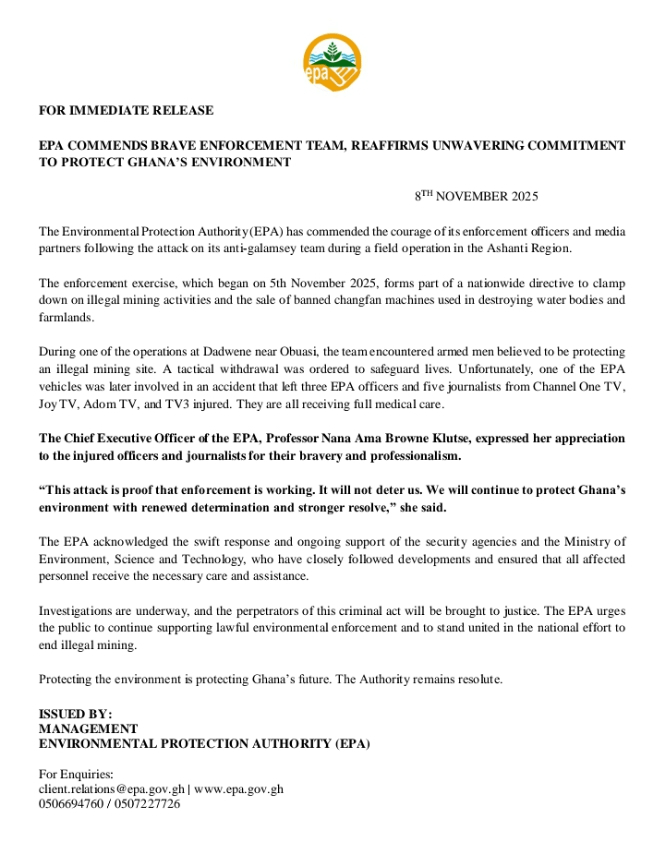 In a statement, the Chief Executive Officer of the EPA, Professor Nana Ama Browne Klutse, condemned the attack but emphasized that it will only strengthen the Authority’s resolve to protect Ghana’s natural resources.