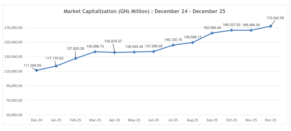 Trade values surged alongside prices. Equity transactions totalled about GH¢3.74billion in 2025 – nearly 74 percent higher than the previous year – while market capitalisation climbed 54.5 percent to roughly GH¢172billion by the end of December. On the surface, these numbers pointed to a broad-based recovery and renewed investor appetite for Ghanaian assets.