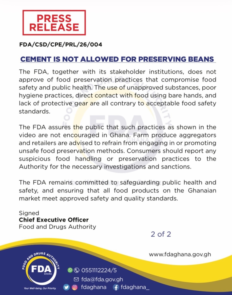The Food and Drugs Authority (FDA) has moved to clarify that a widely circulated video showing beans allegedly being preserved with a white powder suspected to be cement did not originate from Ghana, following preliminary investigations.