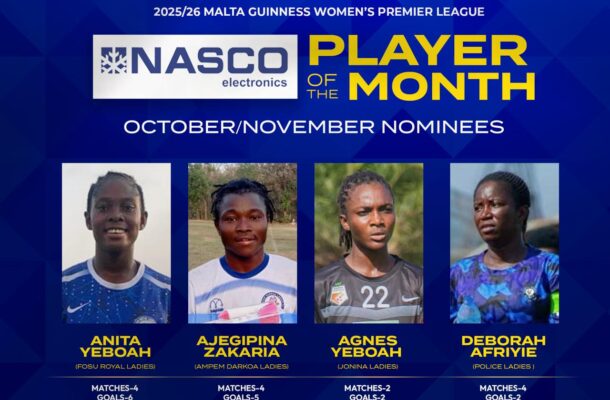 The shortlist for the Nasco player of the month award for October/November in the 2025/26 Malta Guinness Women’s Premier League has been announced, with four standout performers earning recognition for their exceptional early-season form. The nominees include Anita Yeboah (Fosu Royal Ladies), Ajegipina Zakaria (Ampem Darkoa Ladies), Agnes Yeboah (Jonina Ladies), and Deborah Afriyie (Police Ladies), a group whose numbers underline their influence across both the Southern and Northern Zones.