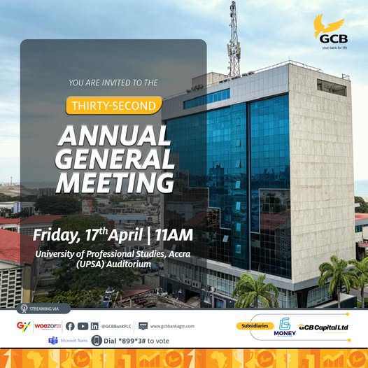 GCB Bank PLC will hold its 32nd Annual General Meeting (AGM) on Friday, April 17, 2026.