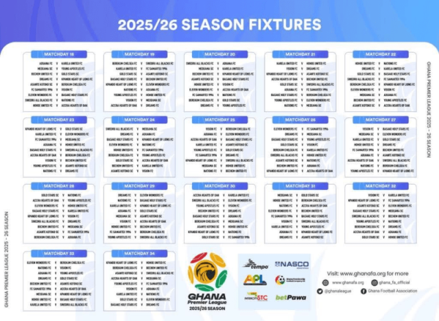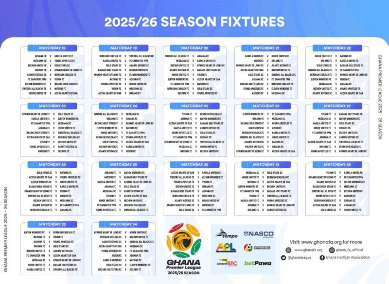 The Ghana Football Association has unveiled the fixture list for the 2025/26 Ghana Premier League season, with one of the season’s biggest highlights being the early Super Clash between Hearts of Oak and Asante Kotoko scheduled for Matchday 5.