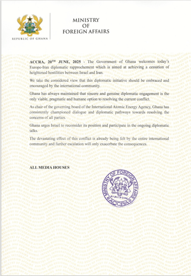 In a statement issued by the Ministry of Foreign Affairs on Friday, June 20, 2025, Ghana called the diplomatic initiative a vital step and encouraged the international community to support the process. The government reaffirmed its long-standing position that sincere and genuine diplomatic engagement is the most viable, pragmatic, and humane approach to resolving conflicts.