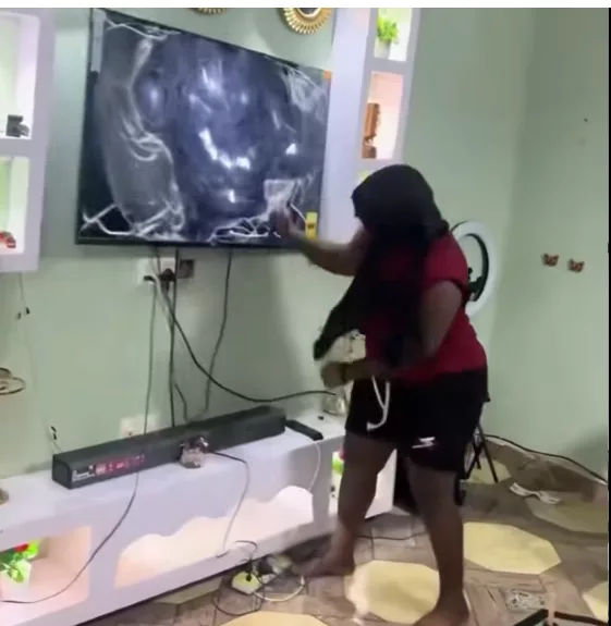 A man shared a video showing his girlfriend destroyiñg his new TV at their home in Osino, Eastern Region, after he received a call from another woman.