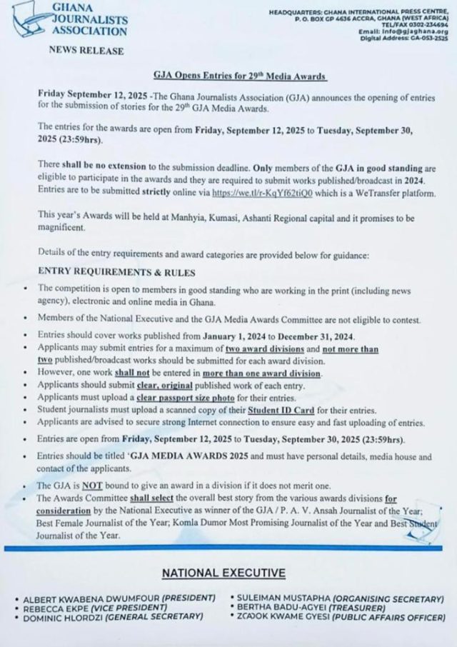 In a statement signed by GJA General Secretary, Dominic Hlordzi, the Association announced that entries will be accepted from Friday, September 12, 2025, until Tuesday, September 30, 2025, at exactly 11:59 p.m. The GJA stressed that no extensions will be granted beyond the deadline.