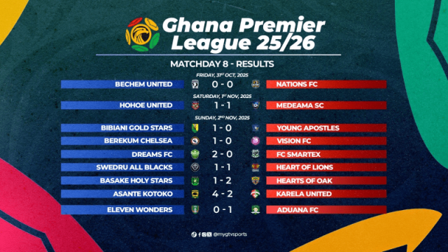 Swedru All Blacks secured a late equalizer against Heart of Lions, earning a 1-1 draw at home. Berekum Chelsea snapped a three-match winless run with a narrow 1-0 win over Vision FC, and Dreams FC notched a confident 2-0 victory against FC Samartex at the Tuba Astro Turf.