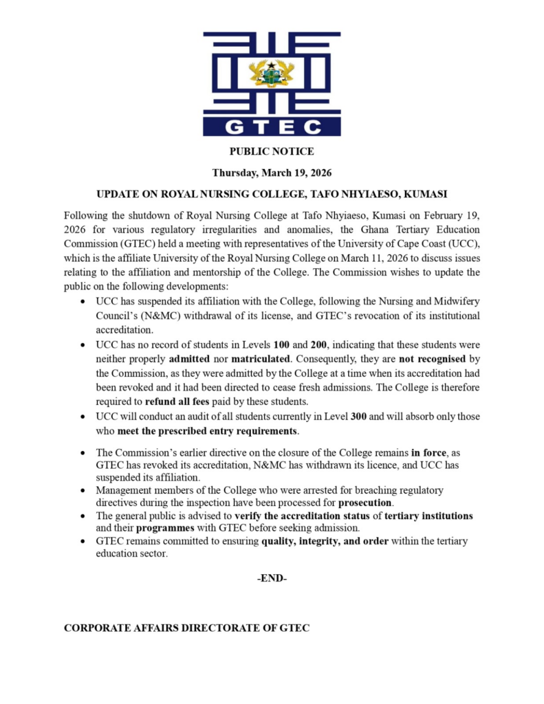 The Ghana Tertiary Education Commission (GTEC) has directed the management of Royal Nursing College in Tafo Nhyiaeso, Kumasi, to refund all fees collected from Level 100 and 200 students following the institution’s closure over regulatory breaches.
