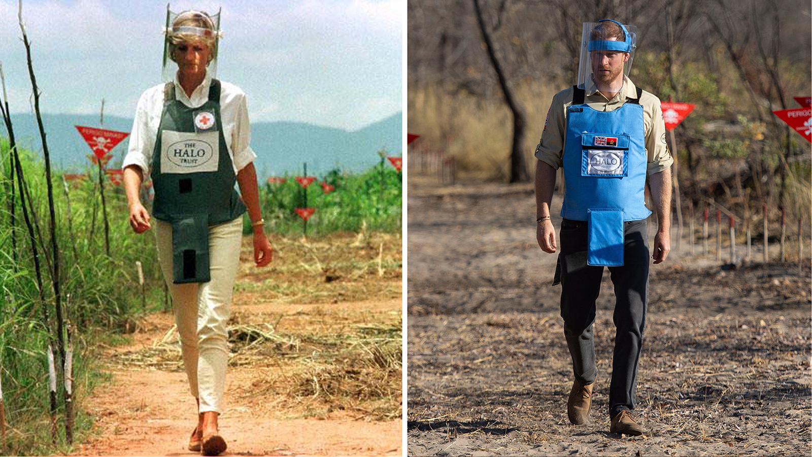 Diana famously wore protective equipment and walked through a cleared path in an active minefield in Huambo, during a break in fighting in the African country’s long civil war.