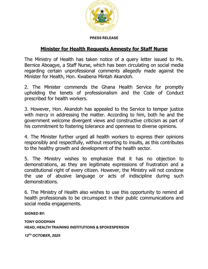 The Minister for Health, Kwabena Mintah Akandoh, has appealed to the Ghana Health Service (GHS) to show leniency toward Ms Bernice Aboagye, a staff nurse who was recently queried over alleged unprofessional comments made about him.