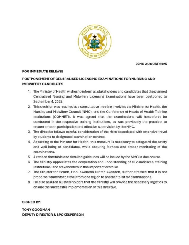 In a press release signed by Tony Goodman, Deputy Director and Spokesperson for the Ministry of Health, the ministry said the examinations will now be conducted in the respective training institutions rather than at centralised locations, reverting to a previous practice. This change, it explained, is to ensure smooth participation and effective supervision by the NMC.