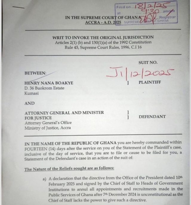 Below are images of the writ filed by Henry Nana Boakye at the Supreme Court of Ghana on February 12, 2025;
