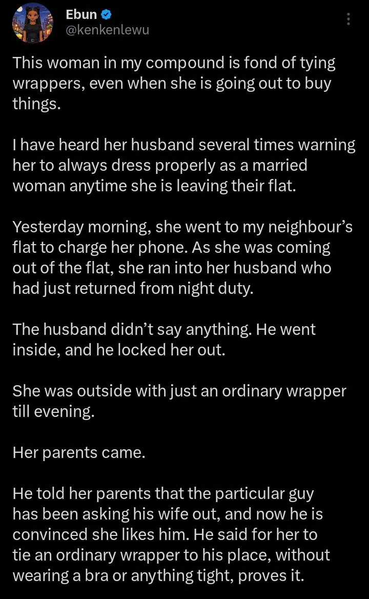 A story shared by @Kenkenlewu on X reveals how an angry husband locked his wife outside their apartment following a misunderstanding he believed was linked to her dressing and alleged interactions with another man.