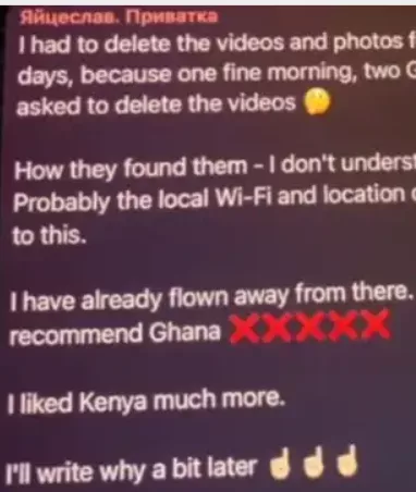 In another leaked message, the man explained to his Telegram followers that he preferred his experiences in Kenya to those he had in Ghana, even saying he would not advise anyone to visit the West-African country.
