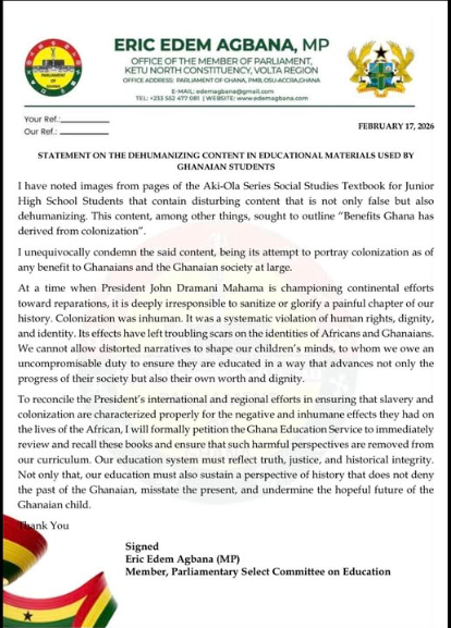 Member of Parliament for Ketu North, Eric Edem Agbana, has criticised content in the Aki-Ola Series Social Studies textbook for Junior High Schools, describing it as “false and dehumanising” for reportedly outlining “benefits Ghana has derived from colonization.”