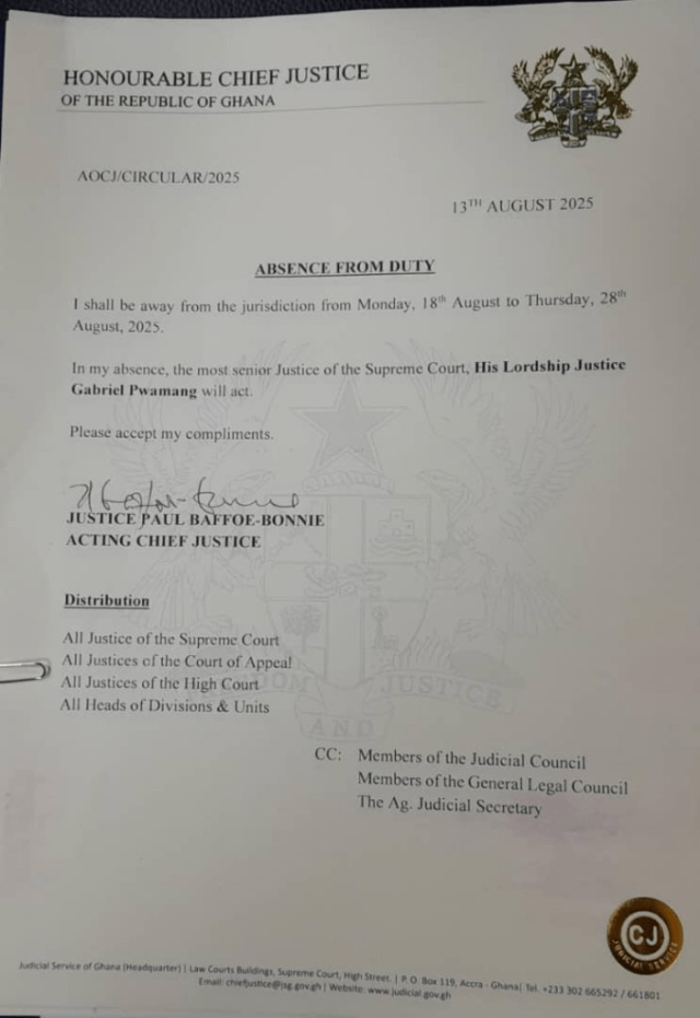 In a statement dated 13th August 2025 with reference number AOCJ/CIRCULAR/2025, Justice Baffoe-Bonnie announced that he will be away from the jurisdiction from Monday, 18th August to Thursday, 28th August 2025.