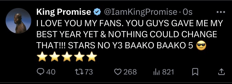 Following Stonebwy’s win, King Promise has reacted. In a tweet shared on X, the 5-Star General thanked his fans for the support thus far.