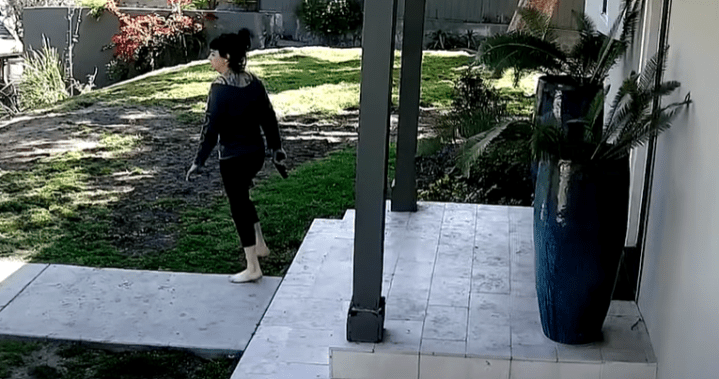 In a separate segment of silent surveillance video from Jillian Lauren’s backyard, Lauren can be seen exiting the home barefoot and carrying a pistol in her right hand.