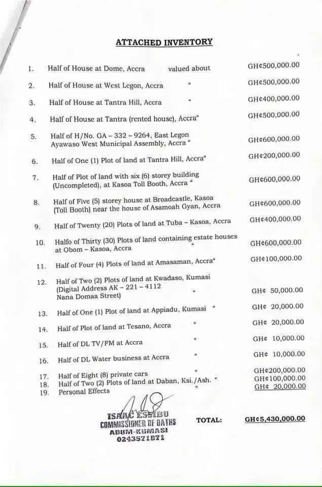 The list hit online after Akosua Serwaa, Ernestina Fosuh, and Charlyn Fosuh jointly ran to the court to seek authority to administer the estate of the late musician. Below is the full list of properties;