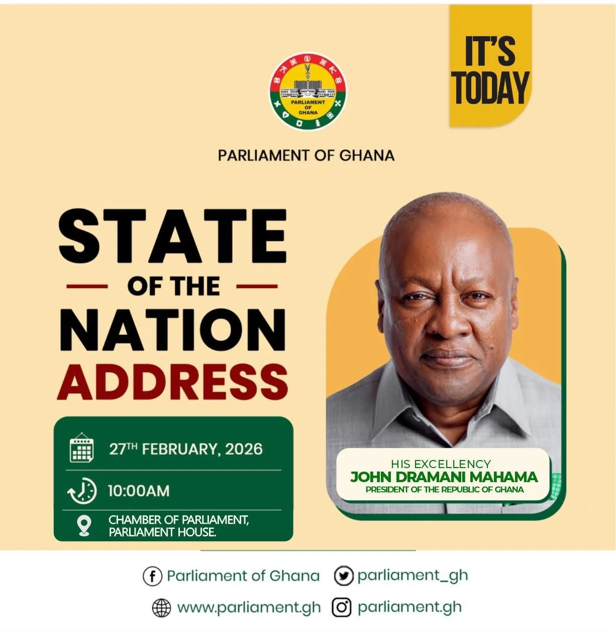 President John Dramani Mahama is today, Friday, February 27, 2026, delivering the 2026 State of the Nation Address (SONA) to a joint session of Parliament.