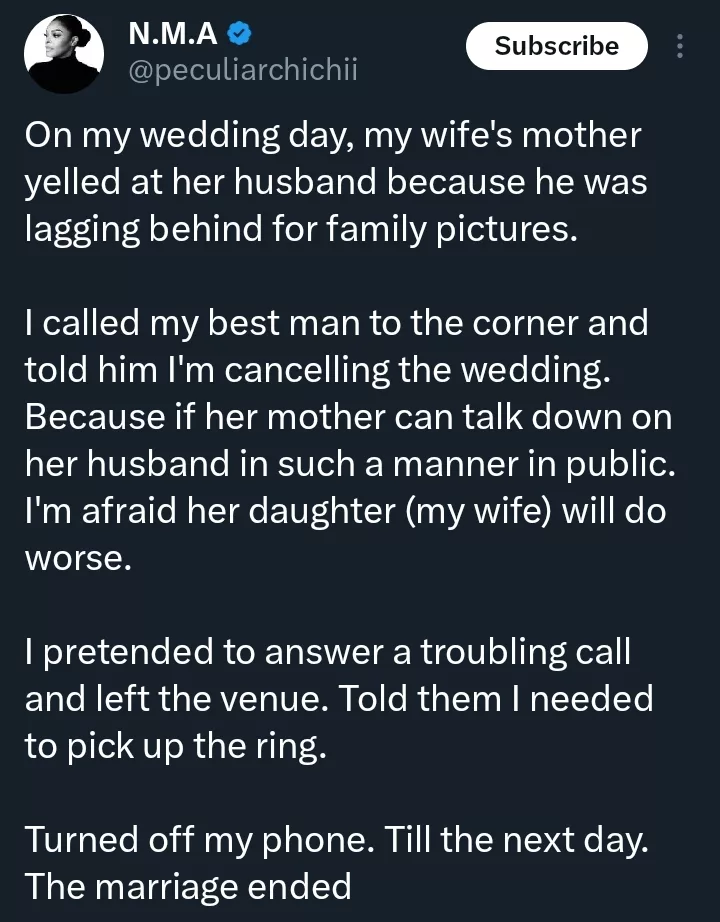 “I called my best man to the corner and told him I’m cancelling the wedding. Because if her mother can talk down on her husband in such a manner in public. I’m afraid her daughter (my wife) will do worse,” he stated.