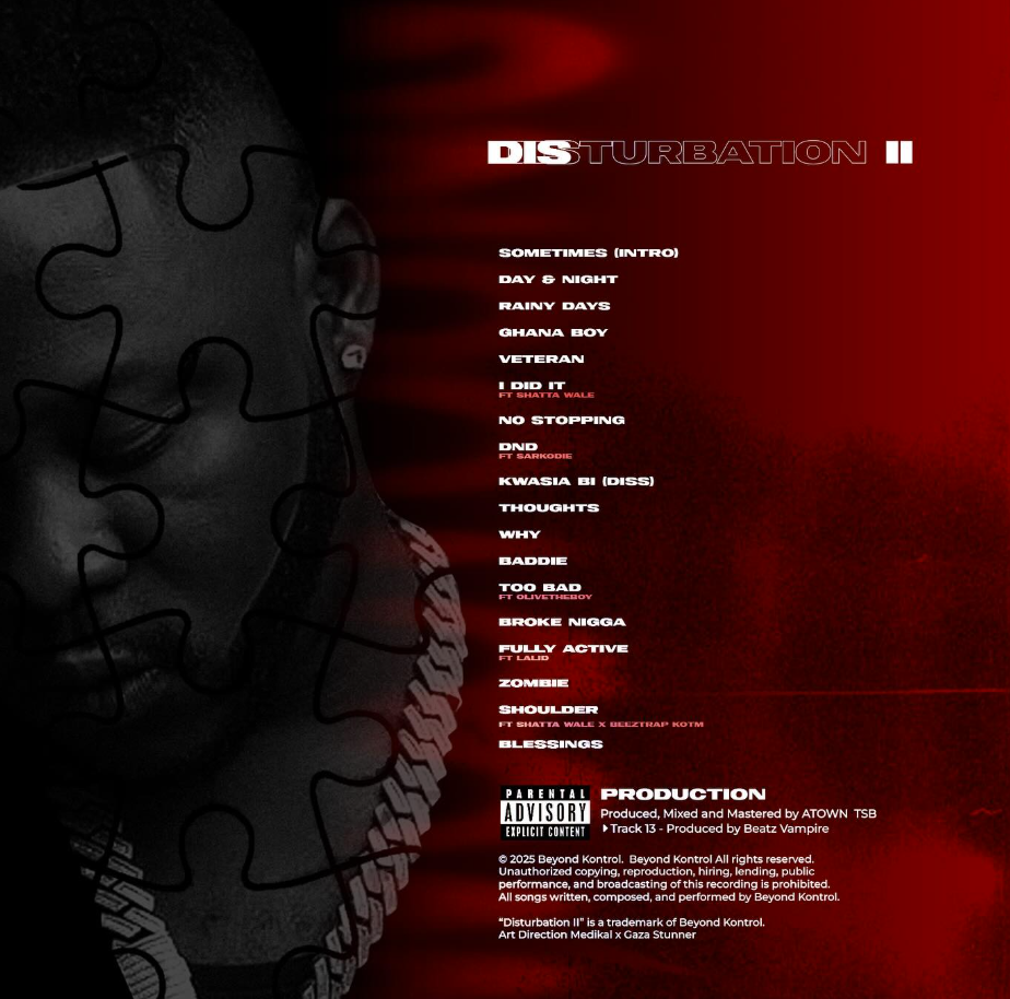 The project, a follow-up to his 2017 debut Disturbation, showcases Medikal’s growth, maturity, and versatility over the years. Known for his witty punchlines, energetic delivery, and distinctive flow, the rapper once again blends rap, Afrobeats, and highlife-inspired rhythms to create a sound that bridges both local and global appeal.