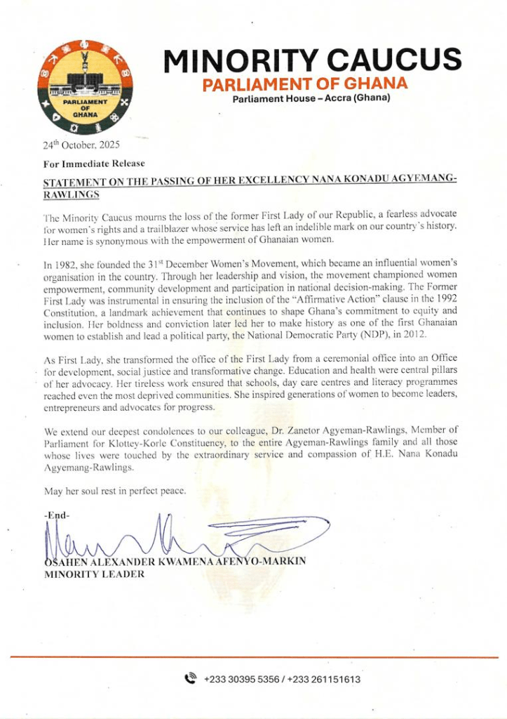 In a statement signed by the Minority Leader, Alexander Kwamena Afenyo-Markin, the Caucus praised the late Mrs. Agyeman-Rawlings for her lifelong commitment to the empowerment of Ghanaian women and her visionary leadership that reshaped the role of women in national development.