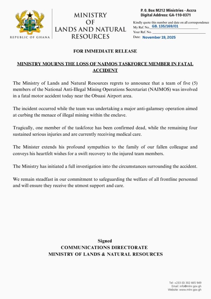 A member of the National Anti-Illegal Mining Operations Secretariat (NAIMOS) taskforce has died after an operational vehicle crashed near the Obuasi Airport area in the Ashanti Region on Wednesday, 19th November 2025.