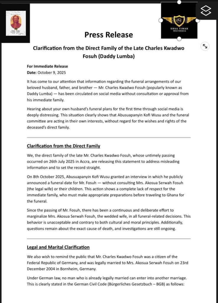 The statement alleged that Abusuapanyin Kofi Wusu and a supposed funeral committee had acted independently by setting the December 6 date without consulting the late musician’s immediate family. It also accused the committee of showing “a complete lack of respect” to Mrs. Fosu, who is still mourning and preparing to travel to Ghana for the funeral.