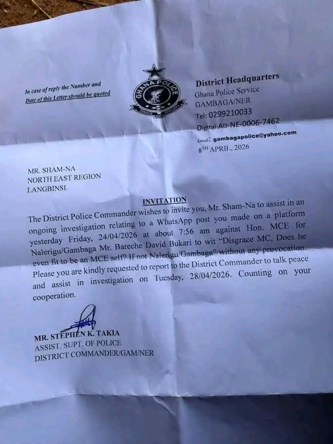 A formal invitation signed by the Gambaga District Police Commander, ASP Stephen K. Takia, requests Shamuna to assist in investigations related to a post he allegedly made on Friday, April 24, 2026, which the police describe as offensive toward the MCE, Mr. Bareche David Bukari.