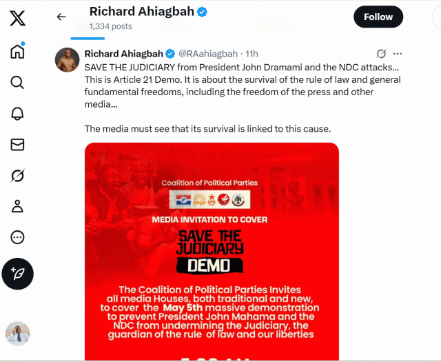 Under the banner “Article 21 Demo,” protesters gathered to demand the restoration of the Chief Justice, framing the issue as a broader defense of constitutional governance and press freedom. NPP Director of Communications Richard Ahiagbah, in a social media post ahead of the protest, accused President John Mahama and the ruling National Democratic Congress (NDC) of undermining the judiciary, warning that “the survival of the rule of law” was at stake.