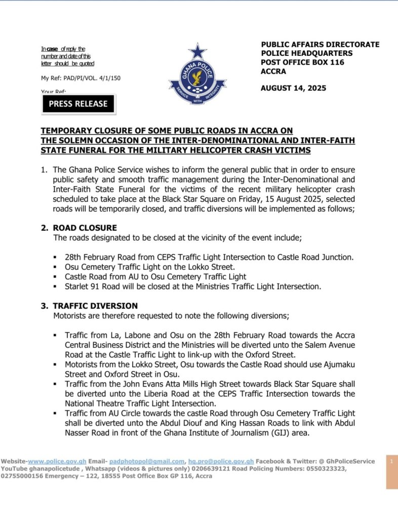 The Ghana Police Service has announced the temporary closure of selected roads in Accra on Friday, 15 August 2025, to ensure public safety and smooth traffic flow during the interdenominational and interfaith state funeral for victims of the recent military helicopter crash. The ceremony will be held at Black Star Square.