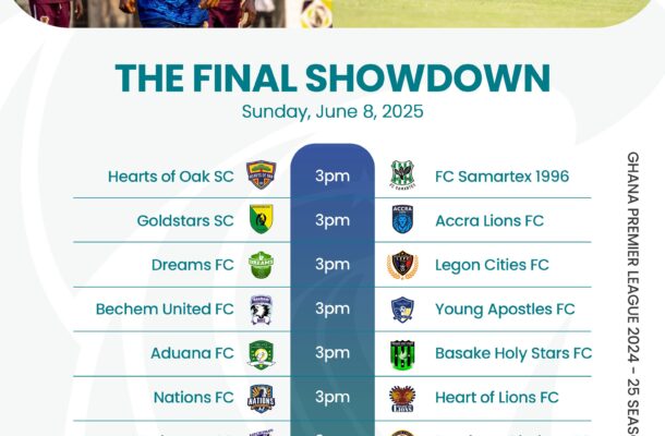 Here’s a match-by-match preview of what to expect on a thrilling final day in Ghana’s top flight on Sunday June 8, 2025, across eight venues.