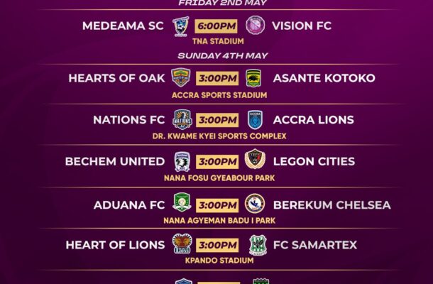 The action continues on Sunday, May 3, with seven crucial fixtures spread across the country, headlined by the iconic clash between Hearts of Oak and Asante Kotoko at the Accra Sports Stadium. Dubbed the “Unmissable 2,” this encounter promises fireworks, with pride, history, and crucial points at stake.