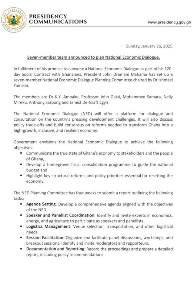 President John Dramani Mahama has inaugurated a seven-member committee to oversee the planning of the National Economic Dialogue (NED). This initiative is part of his 120-day social contract with Ghanaians, aimed at addressing pressing economic challenges and fostering dialogue among stakeholders.