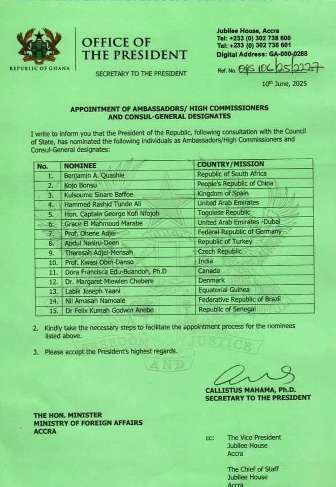 President John Dramani Mahama has nominated 15 individuals for appointment as Ambassadors, High Commissioners, and Consul-Generals designated to represent Ghana in various countries across the globe.