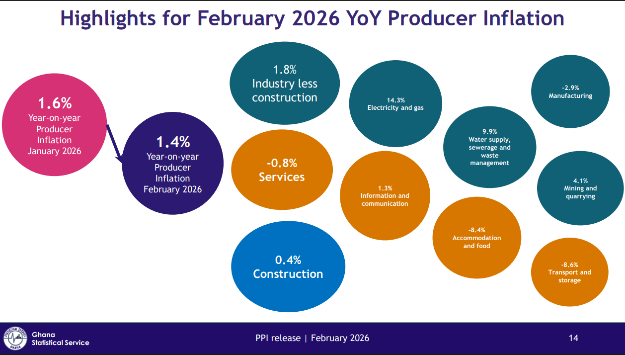 According to data released by Ghana Statistical Service, the decline reflects a moderation in producer price inflation over the past year – although short-term price pressures remain evident.