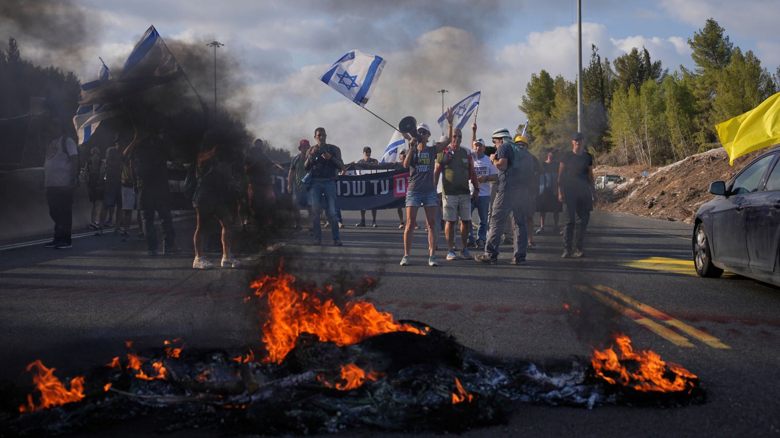 Protesters gathered at dozens of points throughout Israel, including outside politicians’ homes, military headquarters and on major highways, where they were sprayed with water cannons as they blocked lanes and lit bonfires that cloaked roads in smoke.
