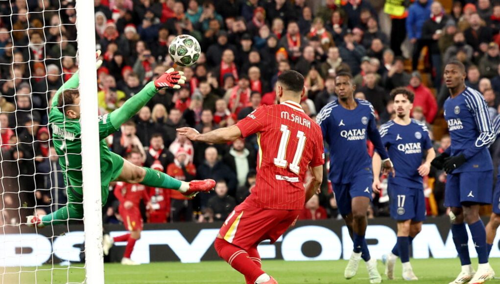 epa11957258 PSG goalkeeper Gianluigi Donnarumma makes a save the UEFA Champions League Round of 16, 2nd leg soccer match between Liverpool FC and Paris Saint-Germain, in Liverpool, Britain, 11 March 2025. EPA/ADAM VAUGHAN