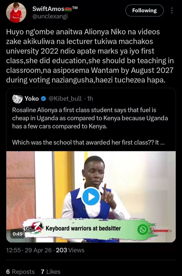 Taking to X formerly Twitter, the man claimed that Roseline was his classmate at Machakos University in 2022, where she pursued a degree in Education.